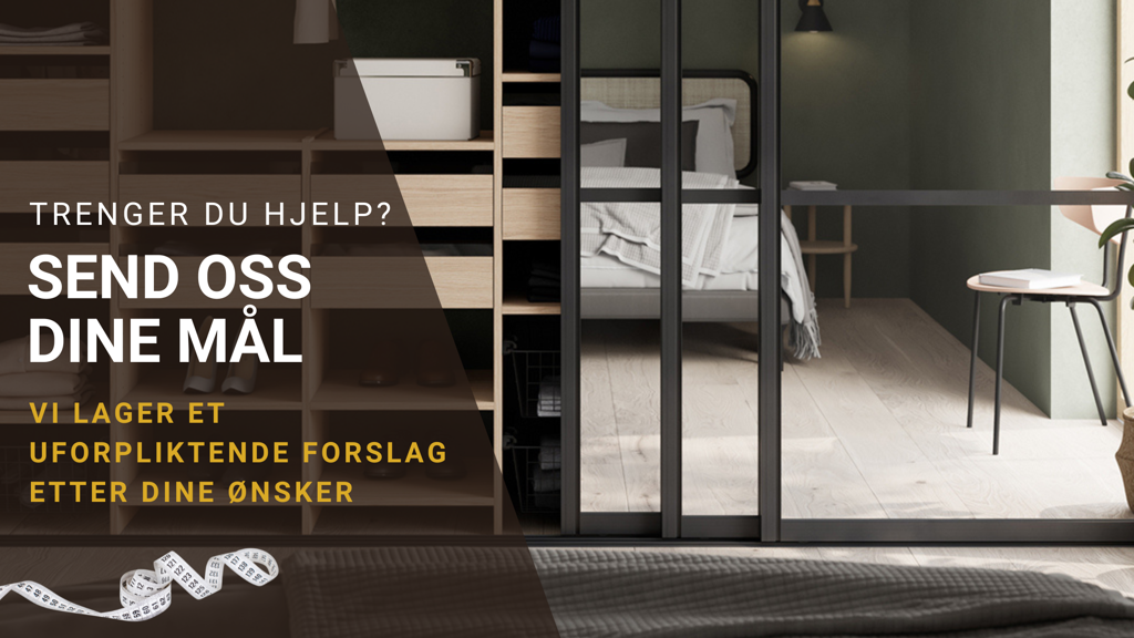 Velg om du vil ha forslag med bare skyvedører, komplett garderobe med skyvedører og innredning eller en Walk In- løsning. Ønsker du mange oppbevaringskurver, eller bare hyller? Garderobestenger i to høyder, med eller uten integrert belysning? Mulighetene er mange!