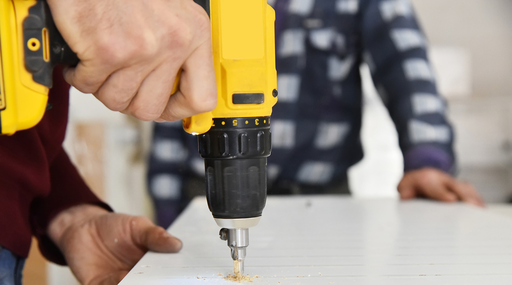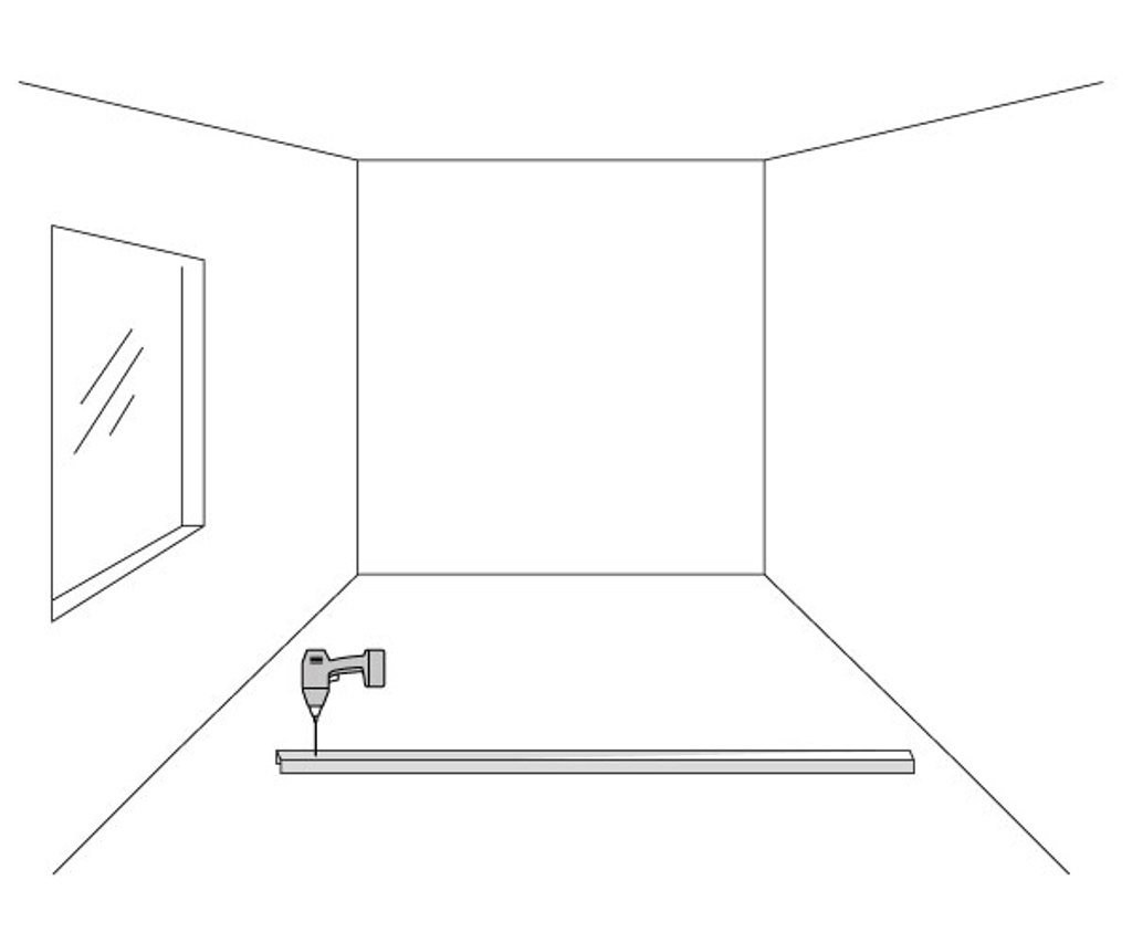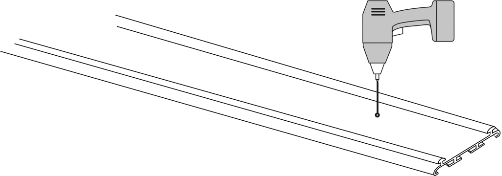2.4 Med skruer, bor hull (metallbor 4 mm) i senter av skinnen ca 100 mm fra enden av skinnen, og videre hver 1000 mm. Skru deretter bunnskinnen fast i gulvet med 16 mm (alternativt 25 mm) treskruer. Langlo anbefaler å montere bunnskinnen med tosidig tape.