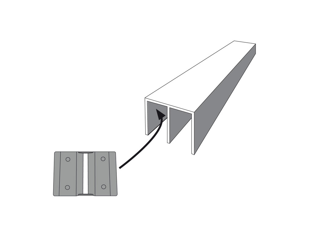 3.3 Dørstopper. Dørstopperbrikken plasseres i toppskinnen slik at døren kan "hvile" i ønsket posisjon, og festes med den tosidige tapen.