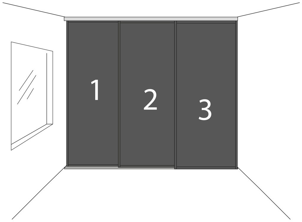 3.1 Sett alle skyvedørene på plass. Start med den bakre døren først. Pass på at dørene er plassert i riktig kanal i toppskinnen og i tilsvarende spor på bunnskinnen. Kontroller at skyvedørene står i lodd.