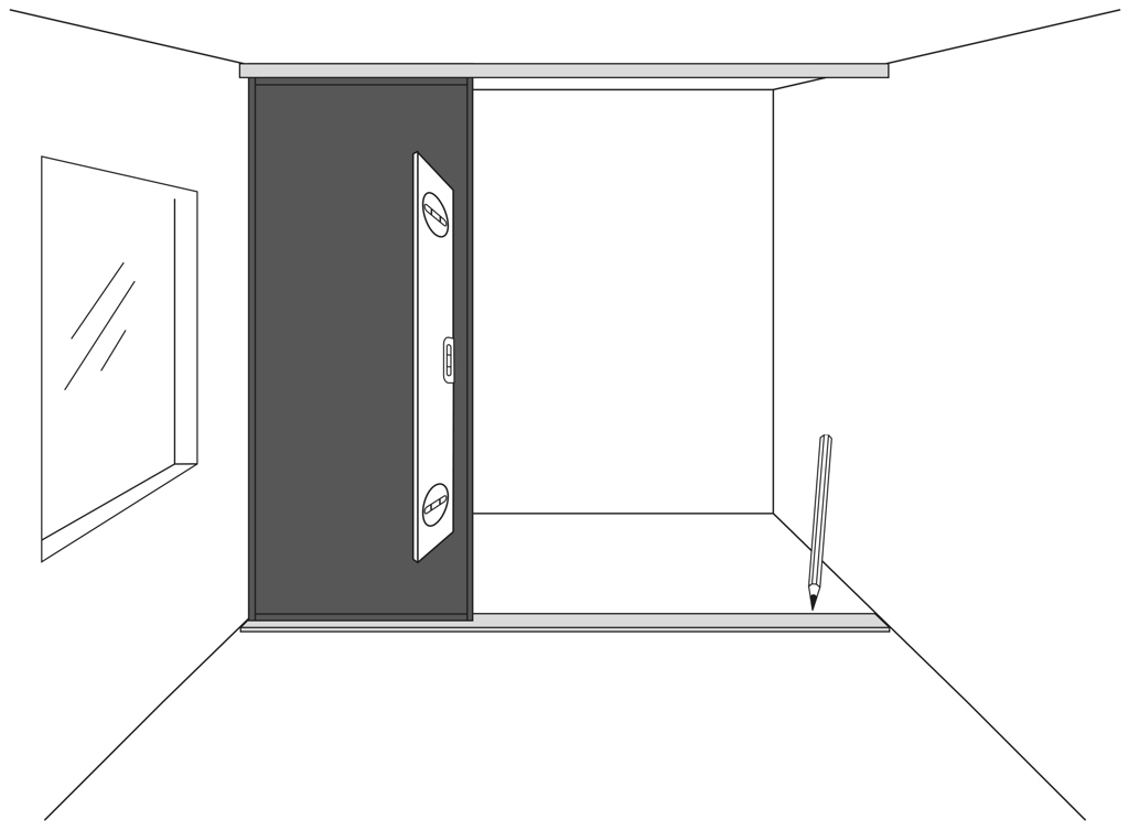 2.2 Sett en dør inn på bakerste spor i topp- og bunnskinne. Kontroller med vater at døren står i lodd. Skyv døren til motsatt side og sjekk at den er i lodd i begge sider av gulvskinnen. Marker med blyant riktig posisjon til gulvskinnen.