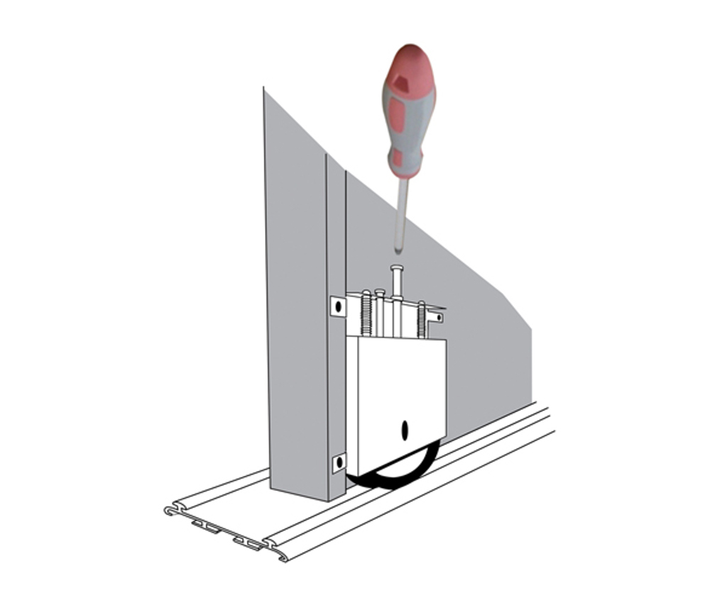 3.2 Finjuster hver dør vertikalt mot vegg ved hjelp av justeringsmulighetene på bunnhjul. Løsne låsemutteren. Juster døren med justeringsbolten. Når døren er i riktig posisjon festes den ved å stramme låsemutteren. Løft døren litt opp slik der ikke er belastning på hjulene når du justerer.
