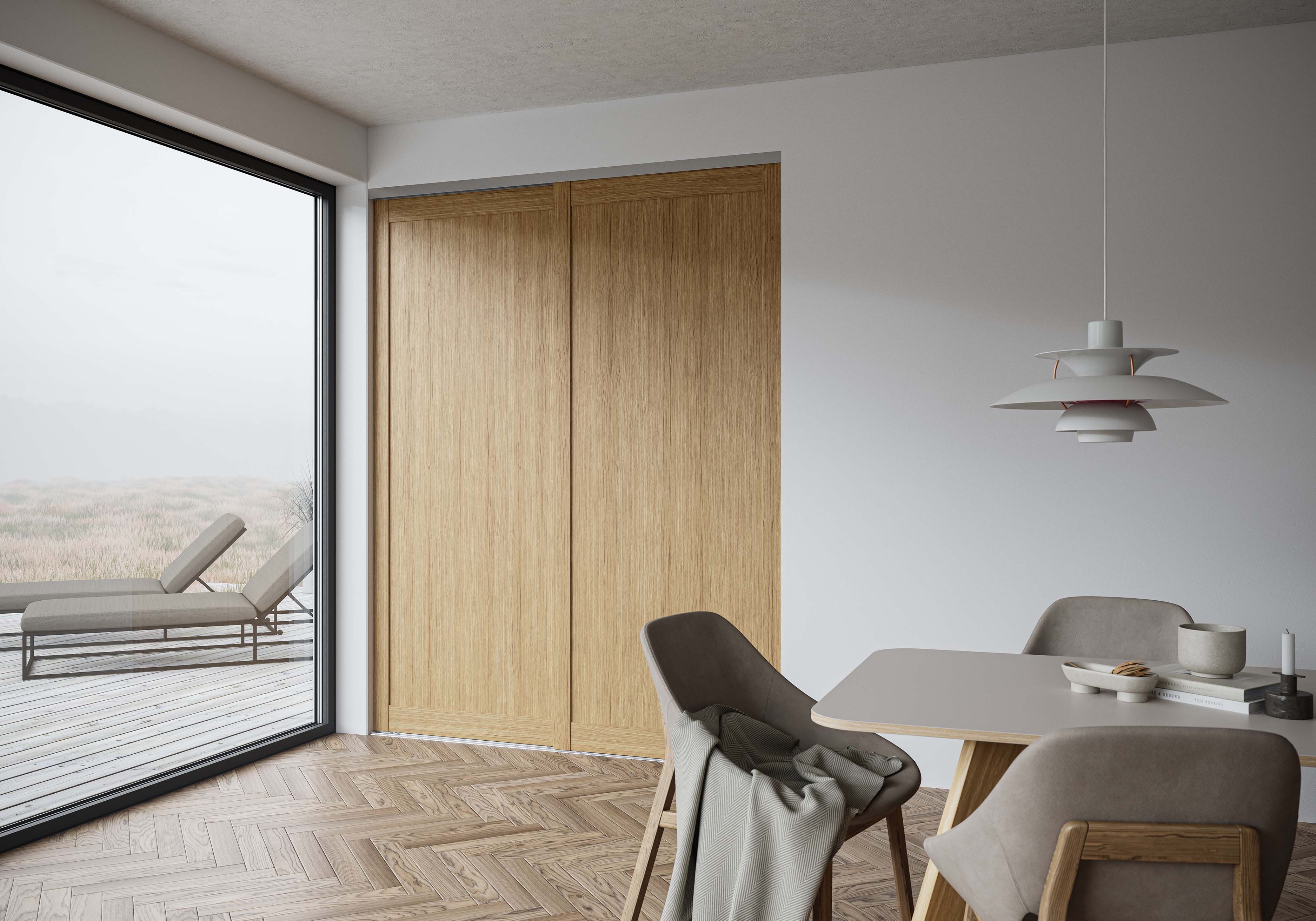 Skyvedørsfronten er en eksklusiv norskprodusert tremodell. Modellen har kraftig og stabil omramming og med ekstra hjulbeslag som bidrar til et kvalitetsløft. Skyvedørene glir lett og lydløst, en kvalitetsfordel du utvilsomt vil sette pris på. Skyvedørene kan leveres med forskjellige inndelinger som hel fylling, to, tre eller fire like felt i fylling. Feltene deles inn med gjennomgående sprosser i samme utførelse som valgte omramming/ profil.